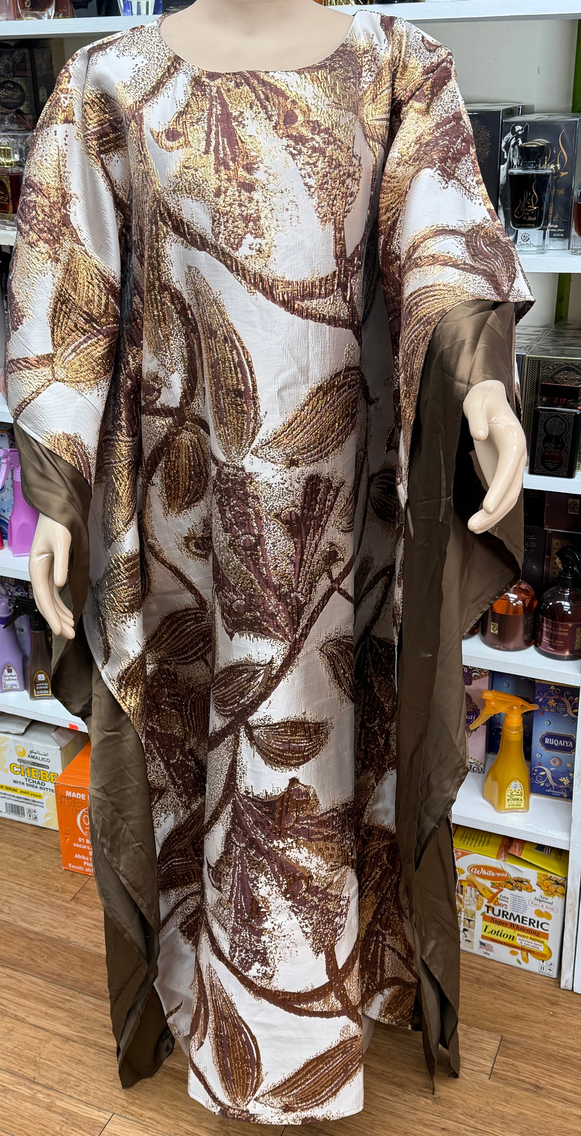 This elegant abaya features a flowing silhouette adorned with a refined leaf-inspired pattern in warm shades of gold, bronze, and soft cream. Crafted with a subtle metallic sheen, the fabric catches the light beautifully, creating a luxurious yet understated look. The wide, draped sleeves add graceful movement, while the earthy tones make it perfect for both daytime sophistication and evening elegance. Effortlessly timeless, this piece blends natural beauty with modern refinement, ideal for special occasions or elevated everyday wear.